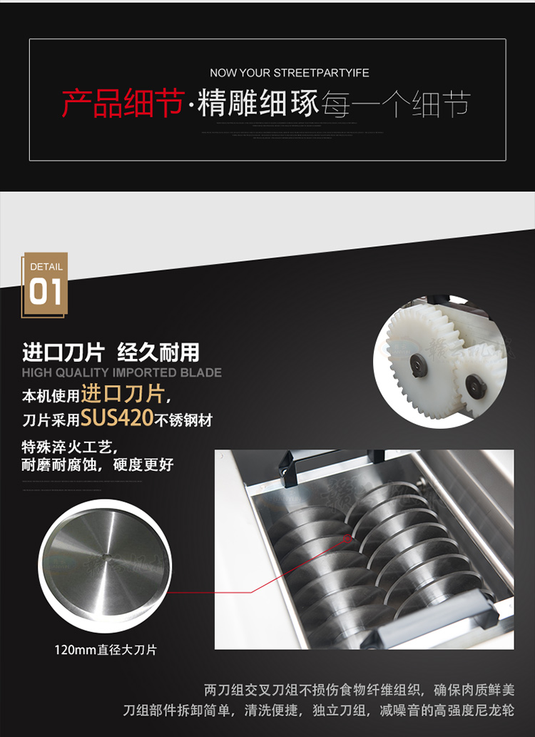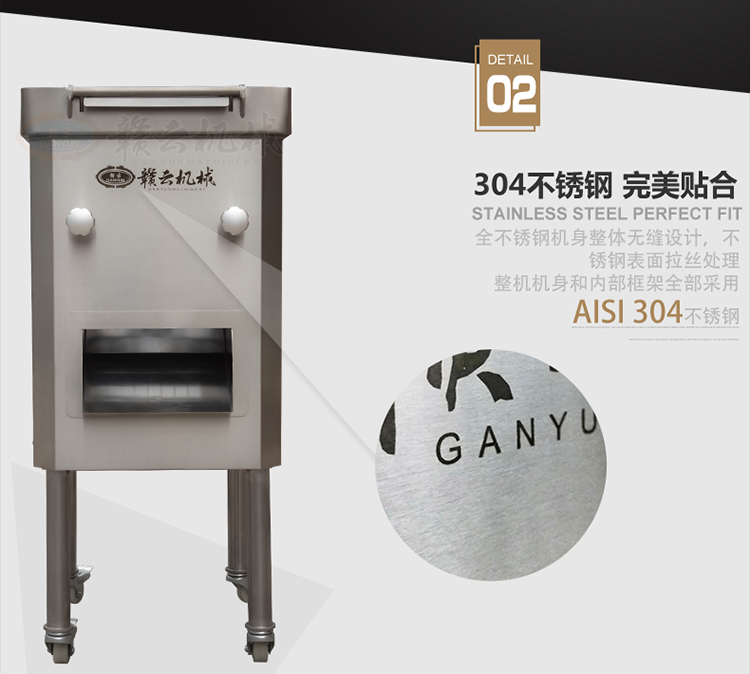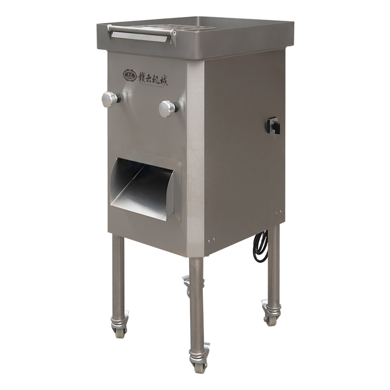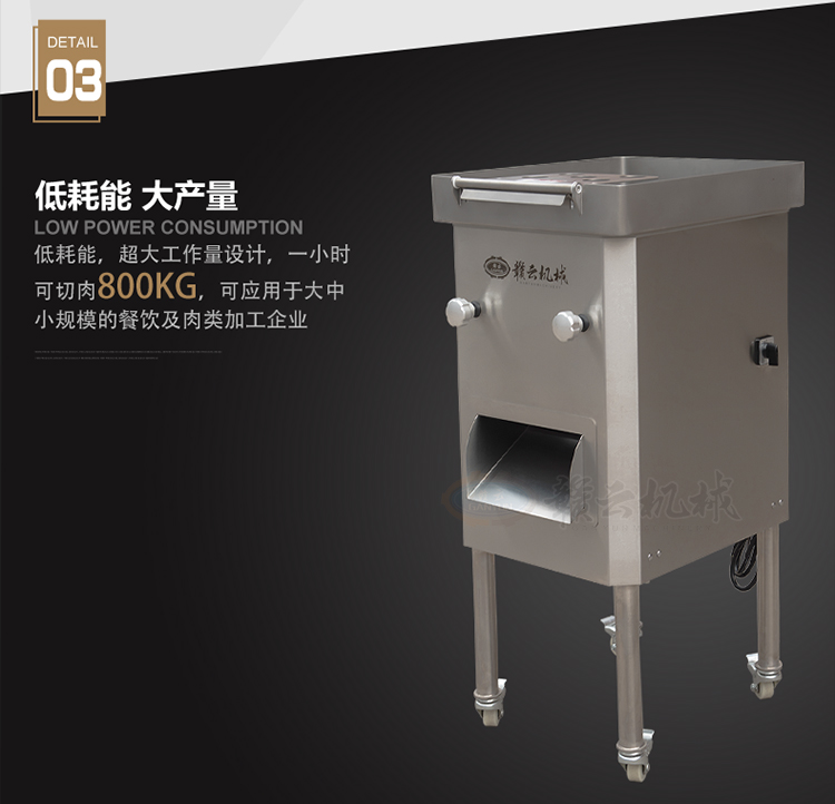 7.機(jī)器功能多,一次切片二次加工可切絲三次加工切丁。可以通過(guò)跟換不同規(guī)格的刀具,切出不同尺寸規(guī)格的肉絲、肉片、肉丁。