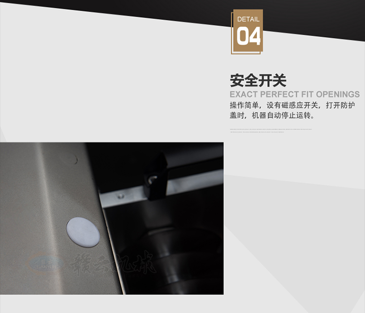 9.入料口設(shè)置安全防護(hù)罩,在機(jī)器運(yùn)轉(zhuǎn)工作時(shí),若將防護(hù)蓋打開(kāi),機(jī)器將會(huì)自動(dòng)停止運(yùn)轉(zhuǎn),保證操作人員安全。防護(hù)蓋為卡扣式設(shè)計(jì),拆卸刀組時(shí)更方便。