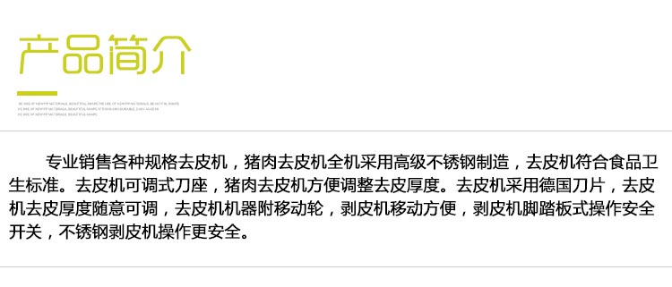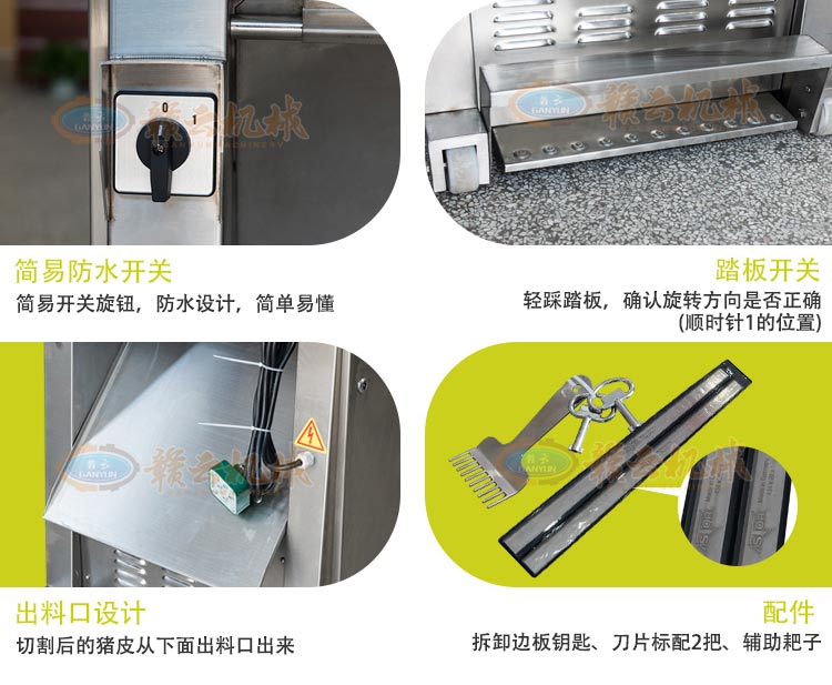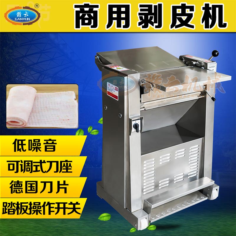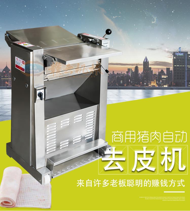 功能與簡單操作說明:豬肉扒皮機機器用于豬肉去皮,包括胴網(wǎng),無骨胸排,無骨腿肉,肩肉和特殊肉塊等。踏板豬肉扒皮機開關(guān),輕踩踏板,確認旋轉(zhuǎn)方向是否正確,將帶有豬肉皮的豬肉整塊放在操作臺上,帶皮的那一面朝下。切割后的豬皮通過出料口出來。