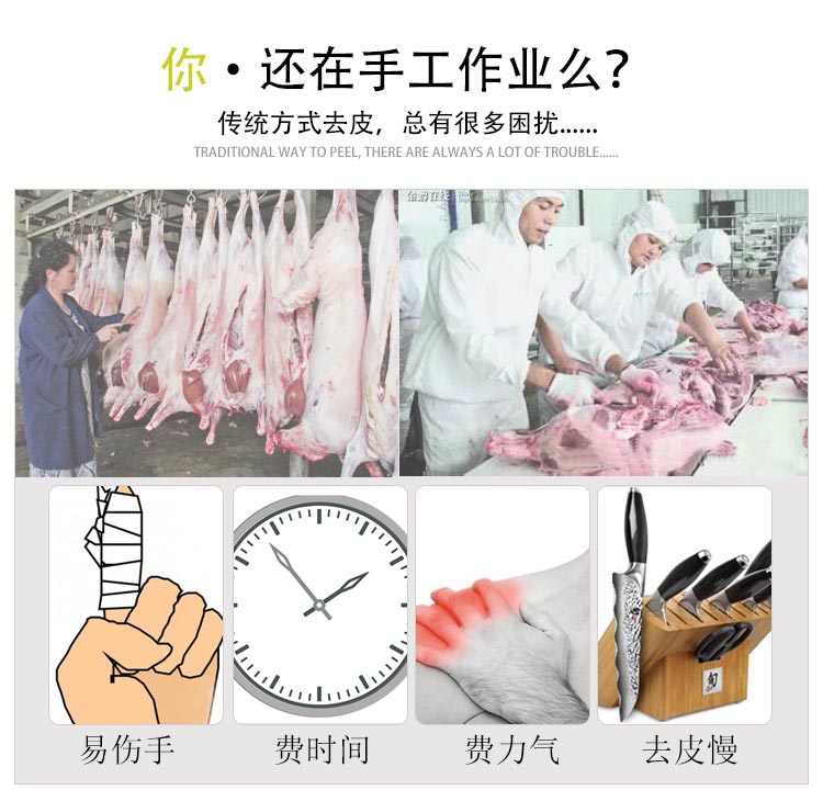 用途:肉類加工廠,豬肉加工廠,屠宰場,中央廚房,配送中心等,適用于較平整的豬肉的皮肉分離,去脂的作用。