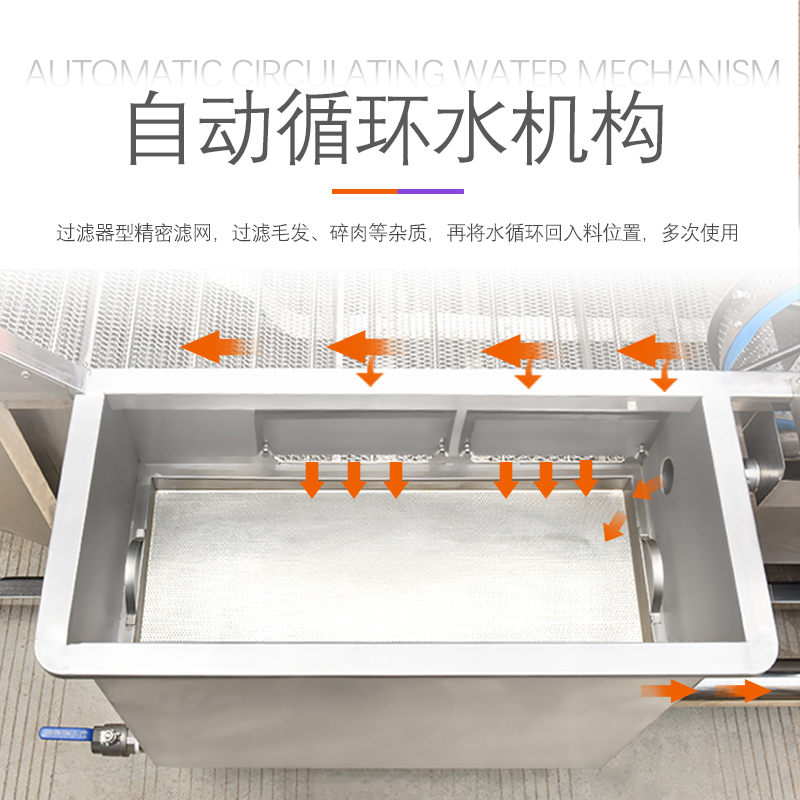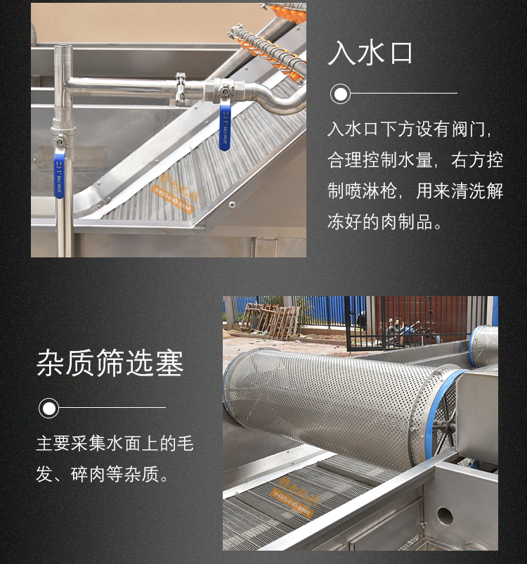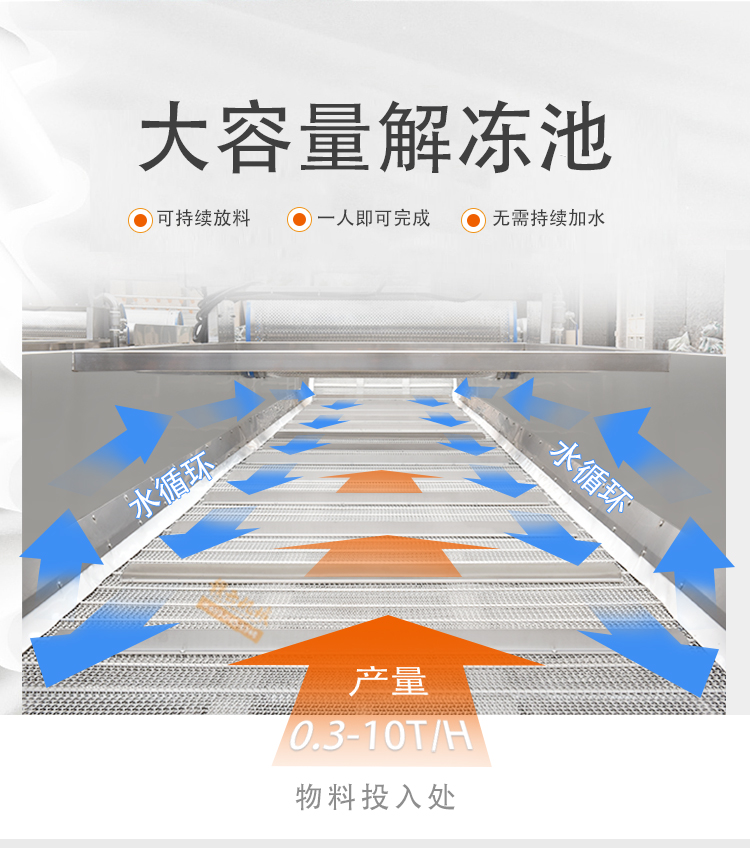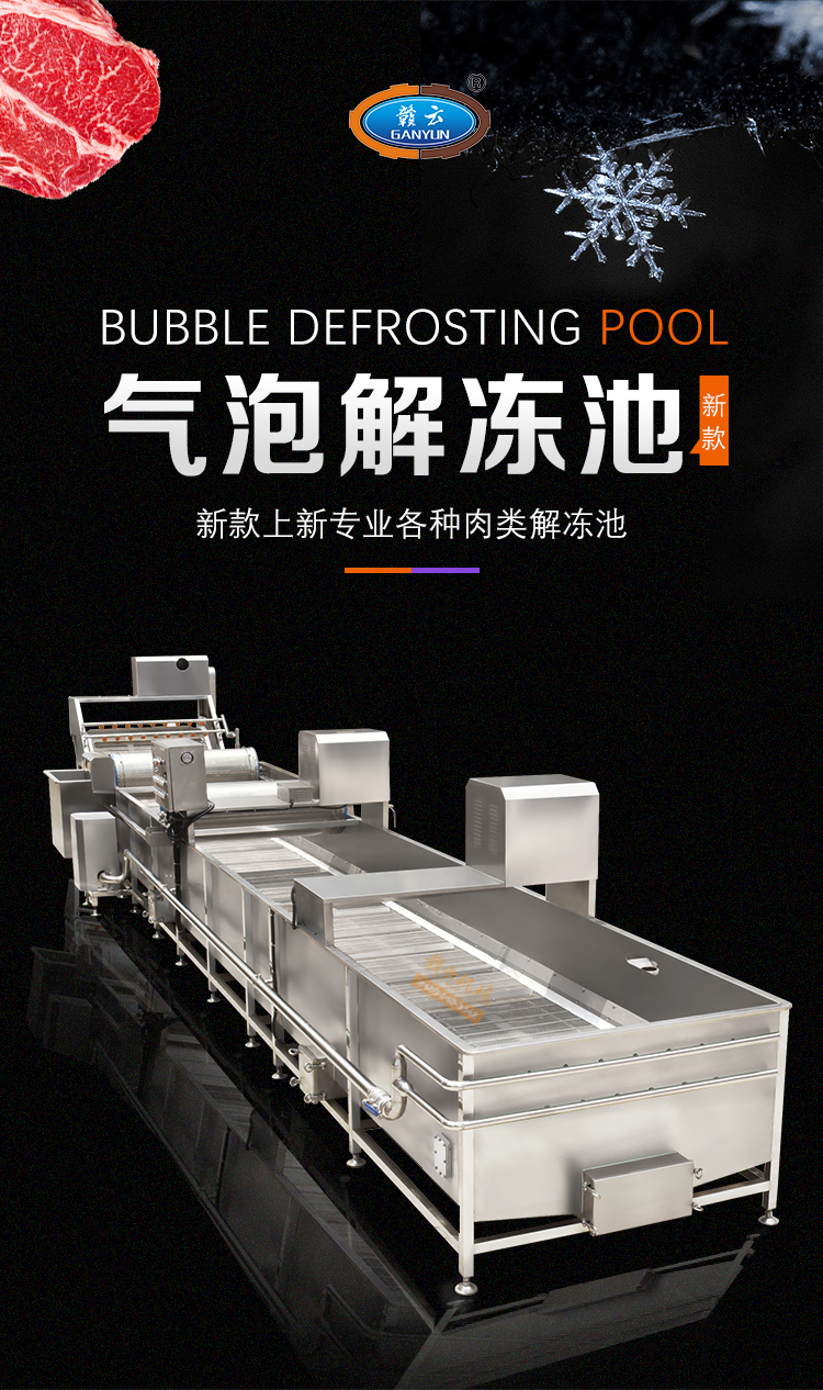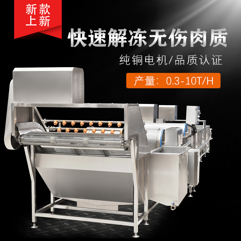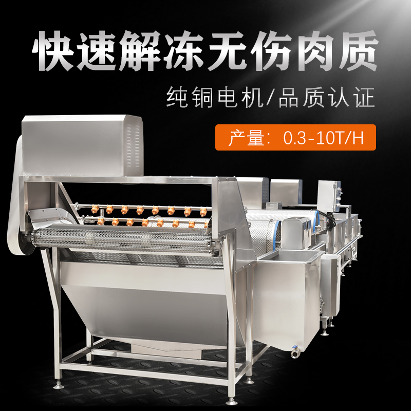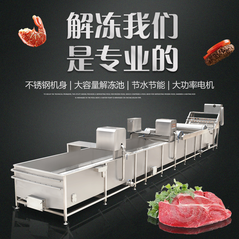 解凍機用于-18度的凍肉或凍制食品的解凍。將凍肉(塊)等物料放進加滿水的解凍池,用氣泡將水翻騰,通過風機往下吹與底部若干出氣孔產生的氣泡,從而達到快速解凍機目的。為保障解凍出來的產品干凈,在出料段設有冷水噴淋;為保障解凍槽里的水質干凈無雜質,在解凍槽外單加儲水槽循環,使產品在解凍過程中,由產品帶入解凍槽里的雜質,經在外水槽里面循環有足夠的時間沉淀,以減少對解凍槽清洗的次數,整機鏈條兩側都配有防護裝置,以防止產品被鏈條卷入造成產品損傷,解凍線輸送鏈板配有整體鏈條提升設計。(輸送網帶可以整體提升便于客戶衛生清理)。解凍池旁邊有恒溫池,水從恒溫池流入解凍機內,隨著凍品的解凍,傳送帶上的產品向出料方向出料,解凍池內的水溫慢慢下降,到出料這段時間,水再從解凍池進入到恒溫池,這樣循環利用,節約環保型。解凍機水箱的底部設置有排水口,該解凍機還包括有其一端上帶有若干出氣孔的氣管以及氣泵,氣泵設置在水箱外,氣管帶若干出氣孔的一端設置在水箱內,其另一端設置在水箱外且與氣泵相連。能夠迅速解凍凍肉,并且節約用水。整機采全不銹鋼制造,腐蝕防銹能力強,即使在環境潮濕的地方機器也不易生銹。