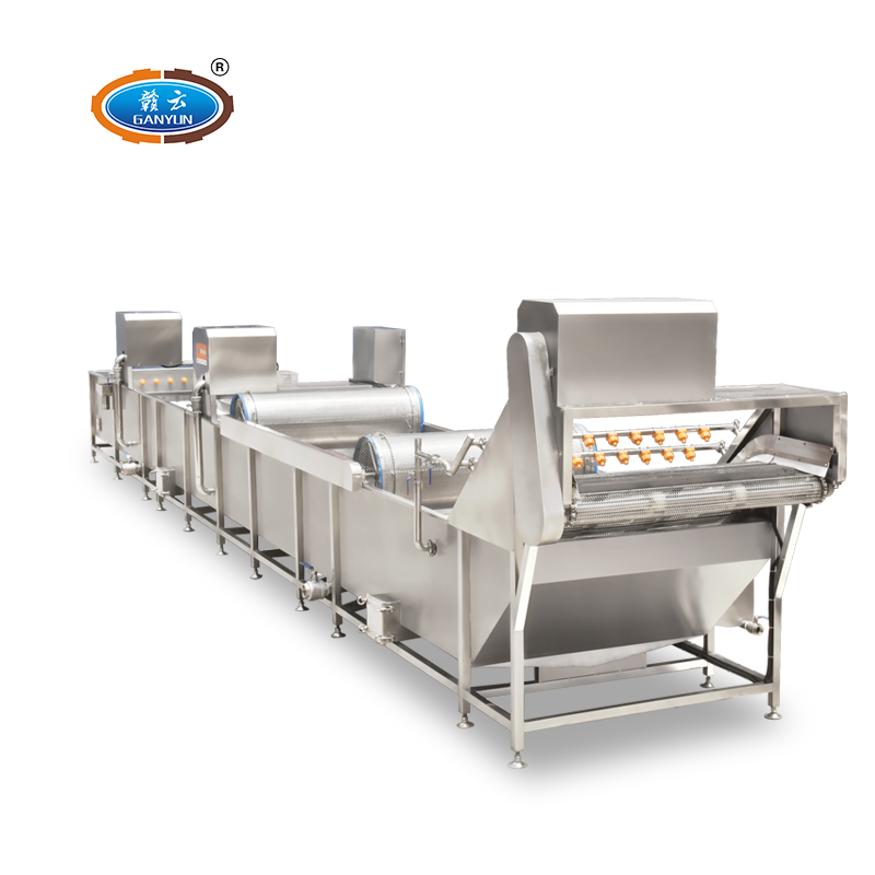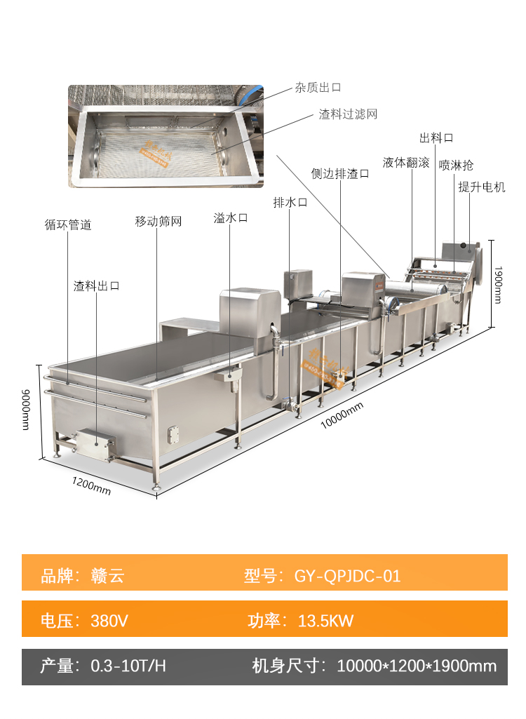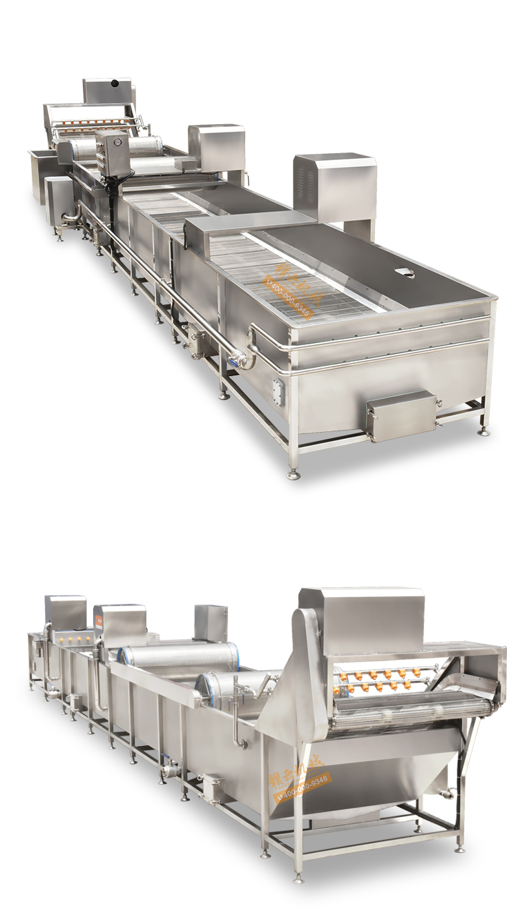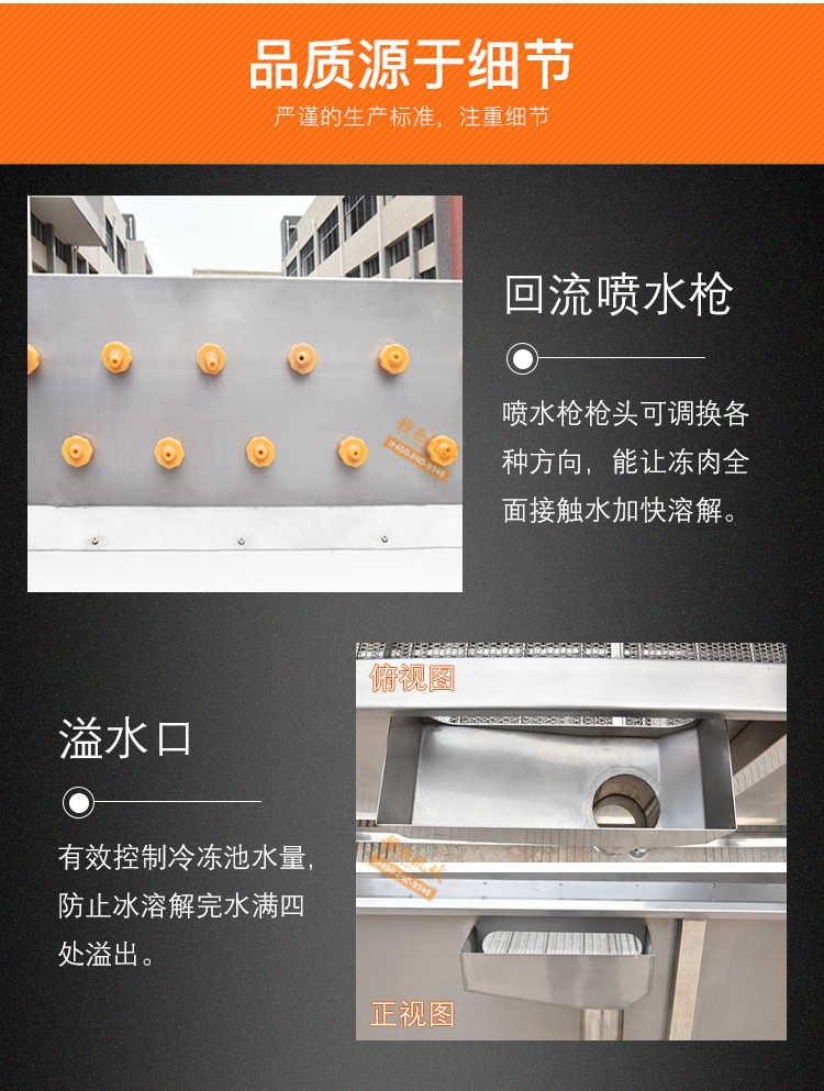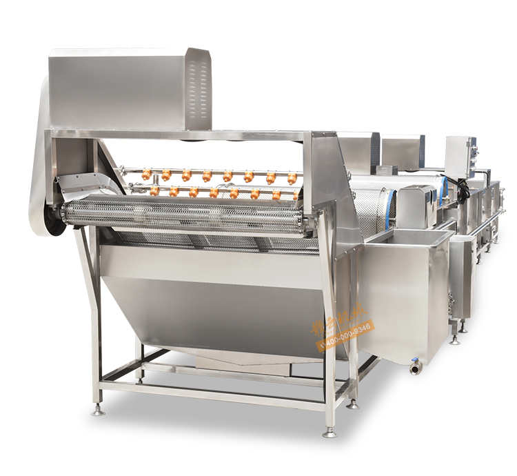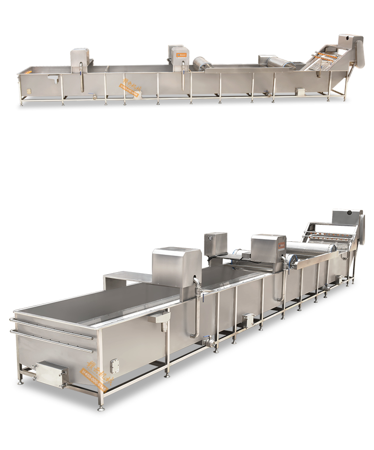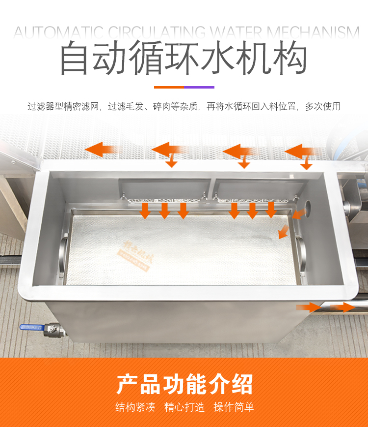 解凍機用于-18度的凍肉或凍制食品的解凍。將凍肉(塊)等物料放進加滿水的解凍池,用氣泡將水翻騰,通過風機往下吹與底部若干出氣孔產生的氣泡,從而達到快速解凍機目的。為保障解凍出來的產品干凈,在出料段設有冷水噴淋;為保障解凍槽里的水質干凈無雜質,在解凍槽外單加儲水槽循環,使產品在解凍過程中,由產品帶入解凍槽里的雜質,經在外水槽里面循環有足夠的時間沉淀,以減少對解凍槽清洗的次數,整機鏈條兩側都配有防護裝置,以防止產品被鏈條卷入造成產品損傷,解凍線輸送鏈板配有整體鏈條提升設計。(輸送網帶可以整體提升便于客戶衛生清理)。解凍池旁邊有恒溫池,水從恒溫池流入解凍機內,隨著凍品的解凍,傳送帶上的產品向出料方向出料,解凍池內的水溫慢慢下降,到出料這段時間,水再從解凍池進入到恒溫池,這樣循環利用,節約環保型。解凍機水箱的底部設置有排水口,該解凍機還包括有其一端上帶有若干出氣孔的氣管以及氣泵,氣泵設置在水箱外,氣管帶若干出氣孔的一端設置在水箱內,其另一端設置在水箱外且與氣泵相連。能夠迅速解凍凍肉,并且節約用水。整機采全不銹鋼制造,腐蝕防銹能力強,即使在環境潮濕的地方機器也不易生銹。