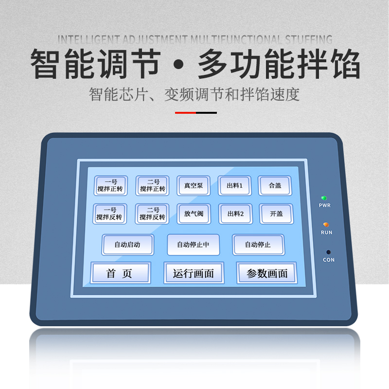 5.功能:該機械采用304不銹鋼機身,可用于攪拌瓜果、蔬菜、肉類的餡料,正反轉攪拌,每個出料口單獨控制,箱蓋、料門均采用氣動自動控制,PLC觸摸屏控制,全自動操作,箱體側板采用10mm、腹板采用6mm 帶加強筋,外觀做噴砂處理。