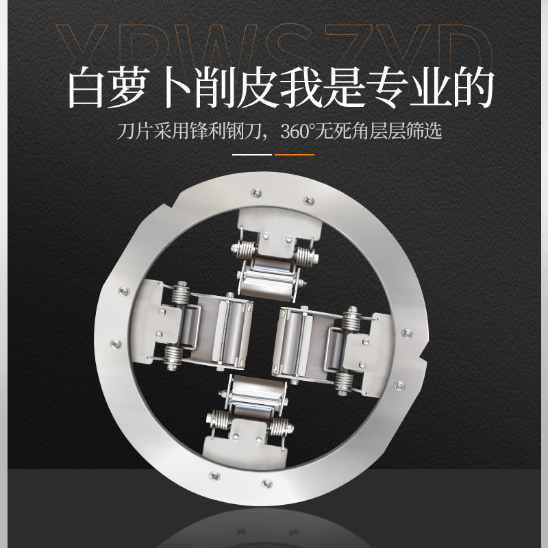 性能:操作簡(jiǎn)單便捷,速度快產(chǎn)量高,大幅地降低人工成本;通過(guò)電機(jī)帶動(dòng)每個(gè)刀俎外的滑輪將白蘿卜進(jìn)入刀俎內(nèi)進(jìn)行削皮,蘿卜的削皮率可達(dá)到百分之九十左右。