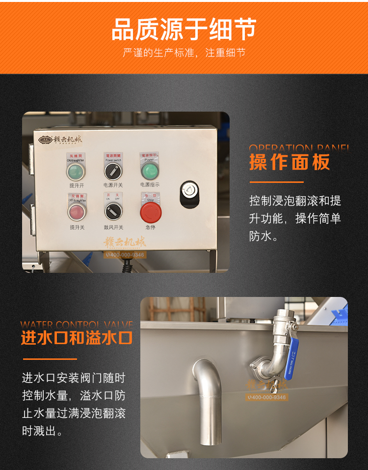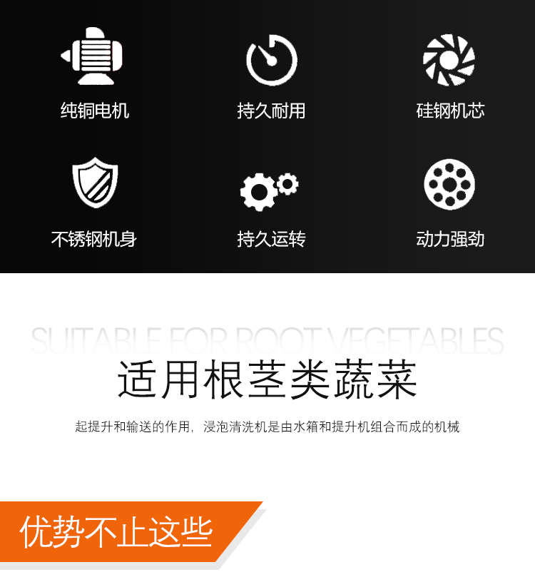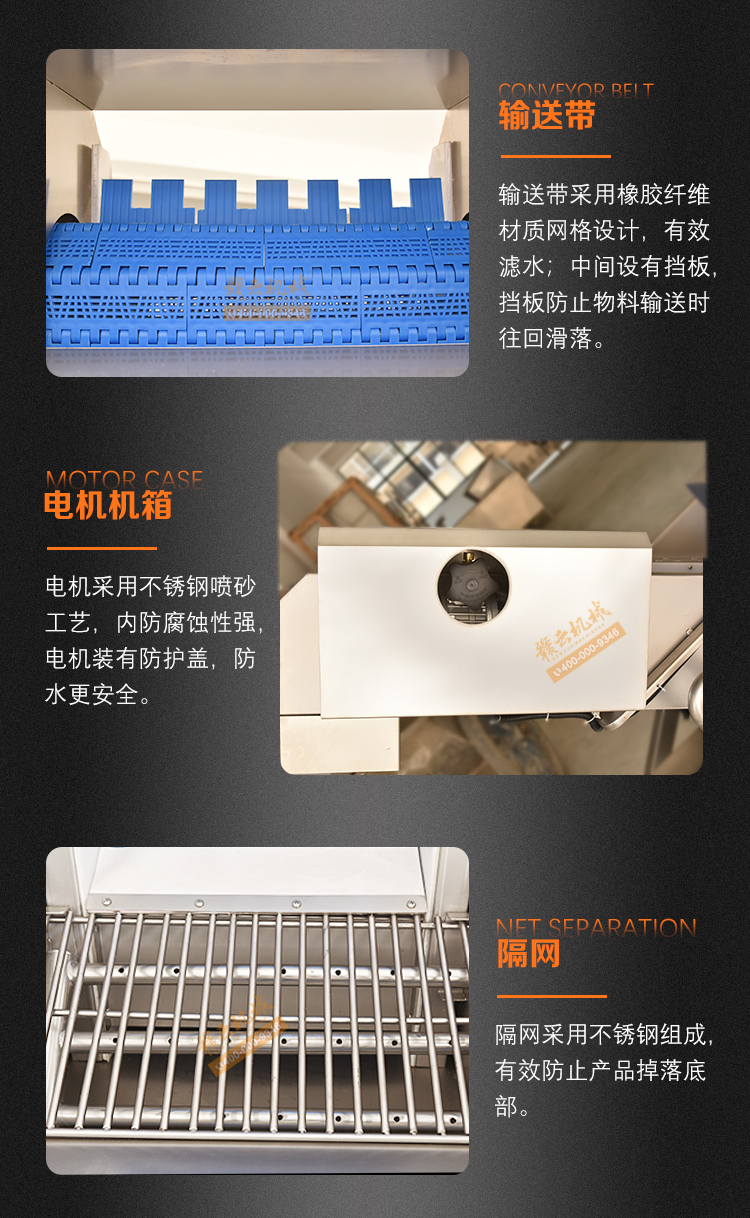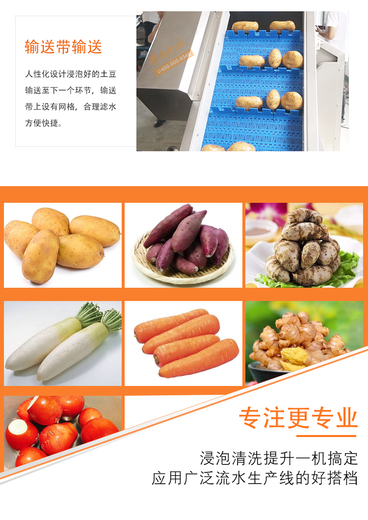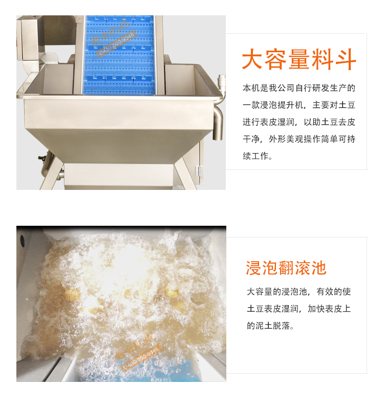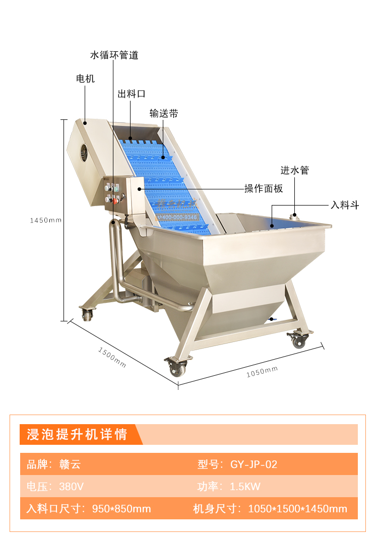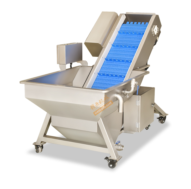 預泡提升機是用于物料的浸泡與提升輸送。結構設計合理,投料方便,投料斗中加裝氣泡。輸送帶可選用不銹鋼網帶或PP材質帶,變頻器調節速度,機身由304不銹鋼制作。將物料放入料斗內,物料水中浸泡,經氣泡推送到輸送帶提升輸送到下一道工序,適合生產線配套使用。機械輸送穩定,簡單易用。機械可根據客戶需求定制,如速度、尺寸、材質等。