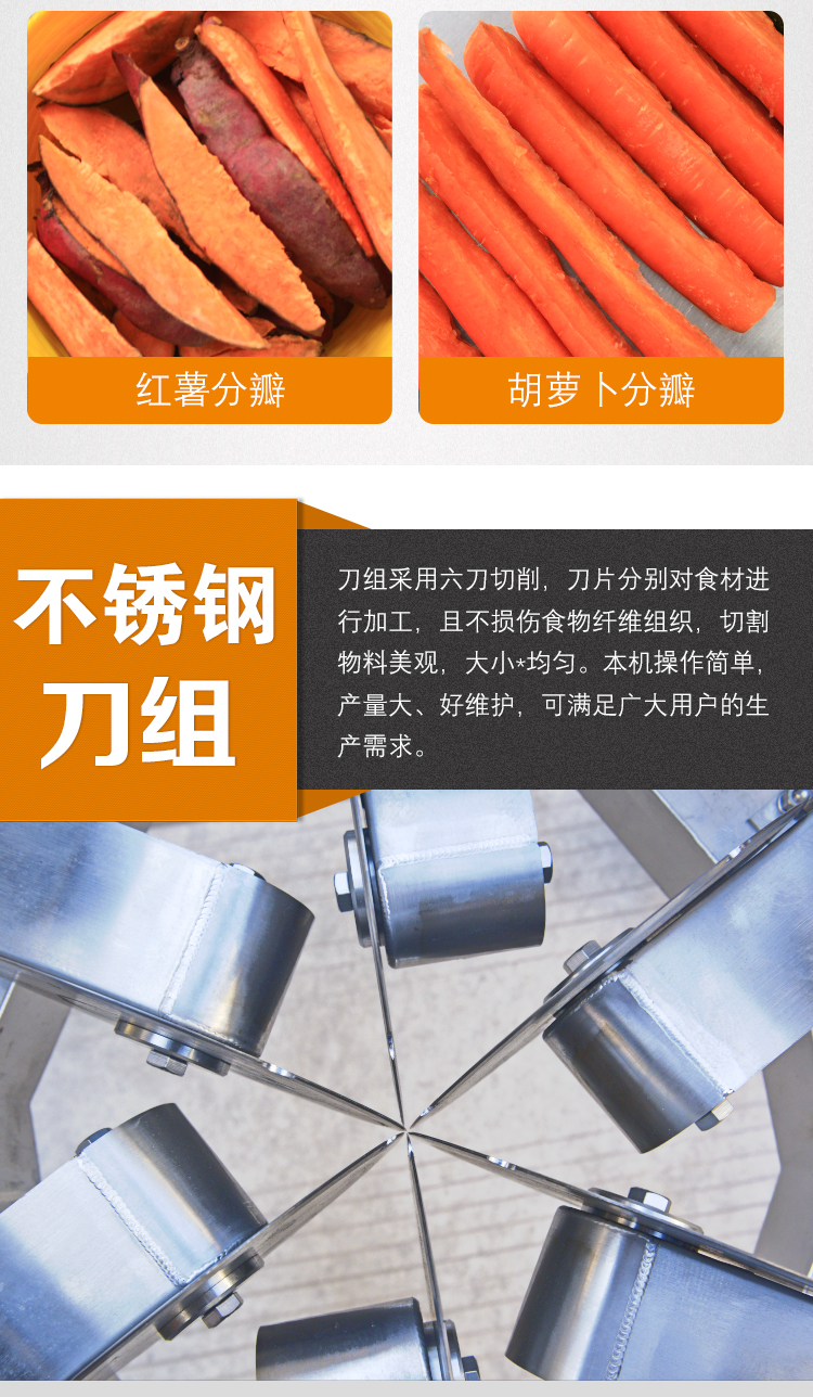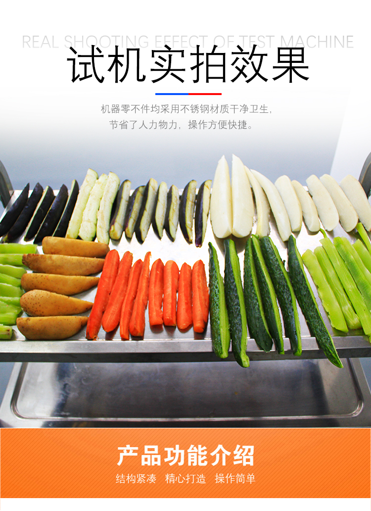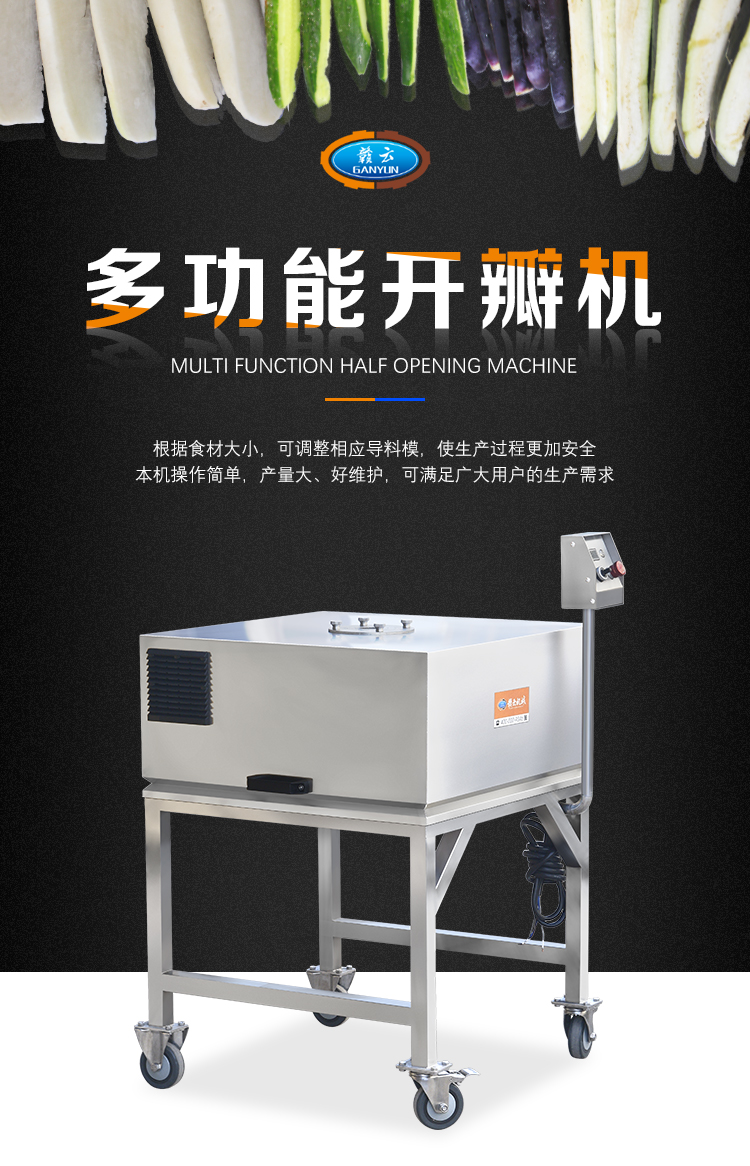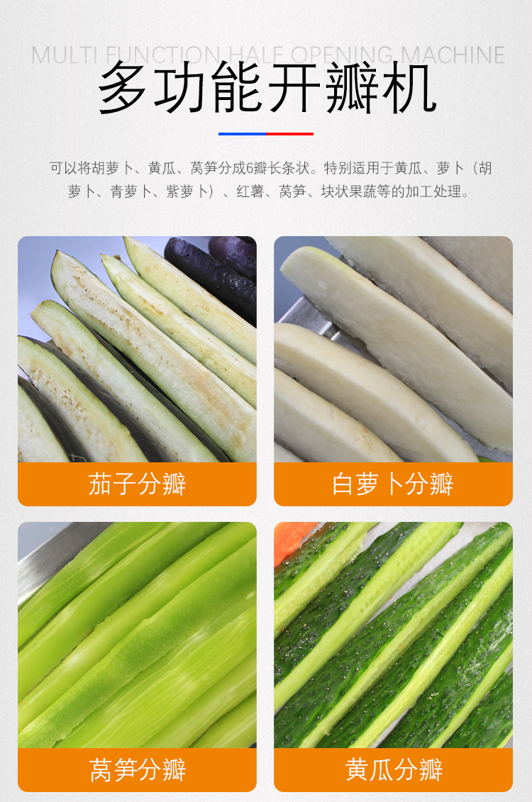 果蔬分瓣機可將黃瓜、茄子、蘿卜、西葫蘆、紅薯、娃娃菜、包菜等蔬果進行切條、分瓣等工作。適用于中央廚房、團善、罐頭加工廠、急速冷凍工廠、干燥食品加工、農(nóng)產(chǎn)品加工、食品加工廠及學(xué)校餐廳等場所。