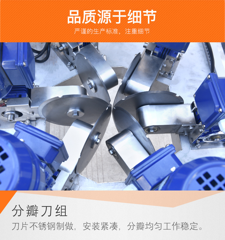 果蔬分瓣機采用不銹鋼刀片,對食材進行切割均勻分瓣,堅固鋒利且不損傷食物纖維組織,切割物料美觀,大小一致。根據(jù)食材大小,可調(diào)整相應(yīng)導(dǎo)料模,使生產(chǎn)過程更加安全。切割速度快、產(chǎn)量大、切割效果好,操作簡單,易于清潔維護,可滿足廣大用戶的生產(chǎn)需求。