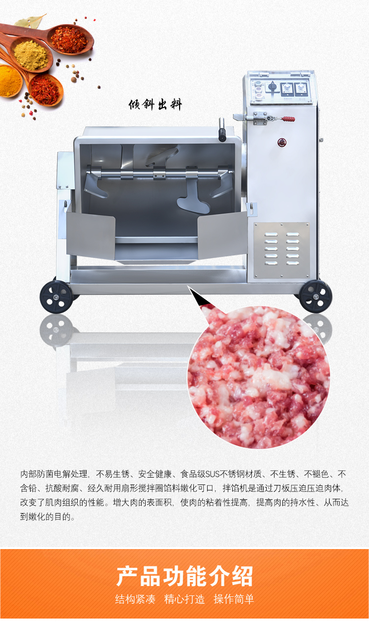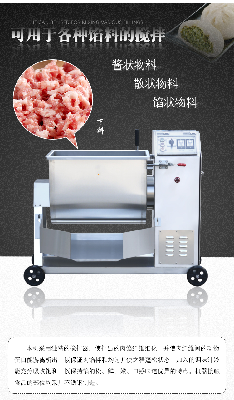 機器可以傾斜倒料,操作方便,而不銹鋼制造,防水防銹能力非常好,可以用水直接沖洗,本機采用扇形攪拌器,攪拌出的餡料嫩滑可口,攪拌出的肉餡纖維細化,并使肉纖維間的動物蛋白能游離析出,肉餡攪拌均勻并使之呈蓬松狀態,加入的調味汁能充分吸收飽和。口感味道優異的特點。