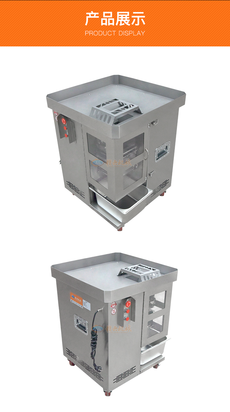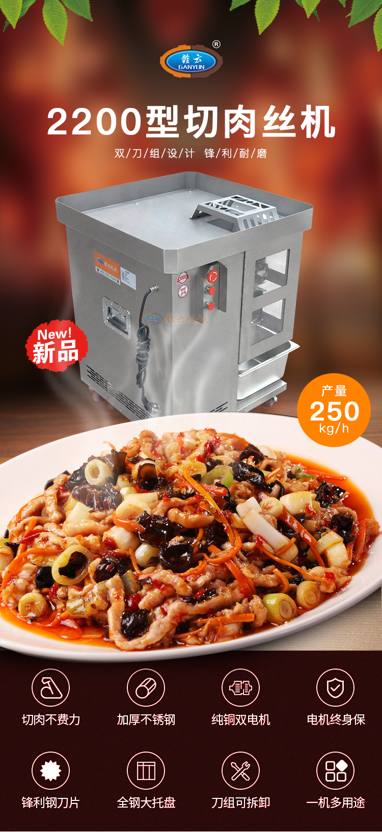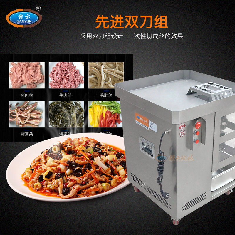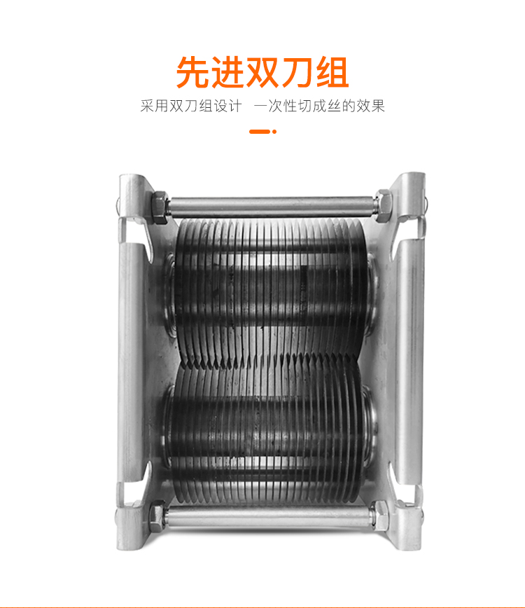 6.機器功能多,一套刀組可以直接切片,兩套刀可以通過跟換不同規格的刀具,切出不同尺寸規格的肉絲、肉片、肉丁。
