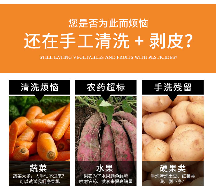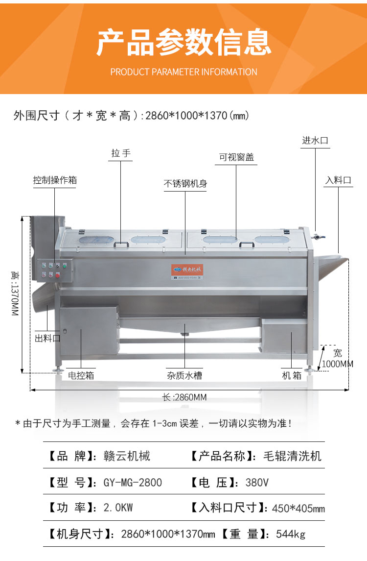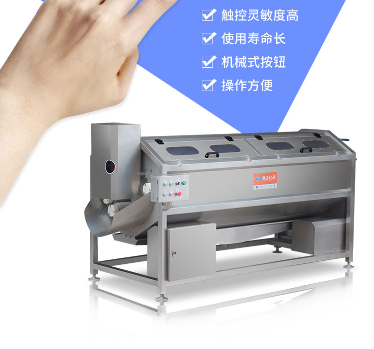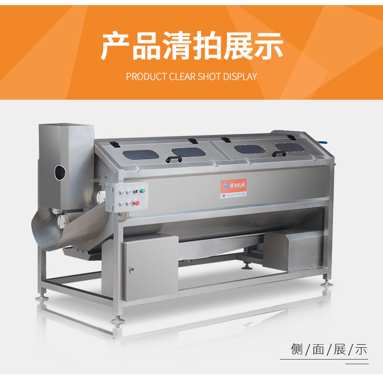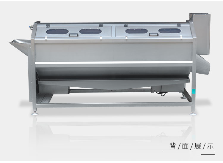 4.優勢:采用優質的毛刷可同時清洗并去除毛芋,土豆,紅薯,生姜等農產品的表皮,可根據需要去皮不同程度的外皮;去皮毛刷采用新料優質毛刷,具有極好的抗倒、抗老化性能;去皮毛刷具有可修復性,正常使用情況下,毛刷壓倒情況下,可用80度開水進行澆淋修復;機器整機采用加厚304不銹鋼制造,內部設置有噴淋裝置,去皮過程無需人工噴水澆淋;底部設置有集中排污設計,有過濾網過濾果皮沙粒,底部集中排水,不會造成車間環境污染